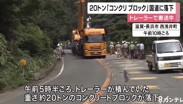 2020年7月20日 滋賀県長浜市の山の中を走る国道左カーブで運転手がハンドルを左に切ったところ積み荷固定ワイヤーが切れ 積み荷 の北陸新幹線用橋げたが道路上に落下 けが人なし 産業安全と環境問題について考える