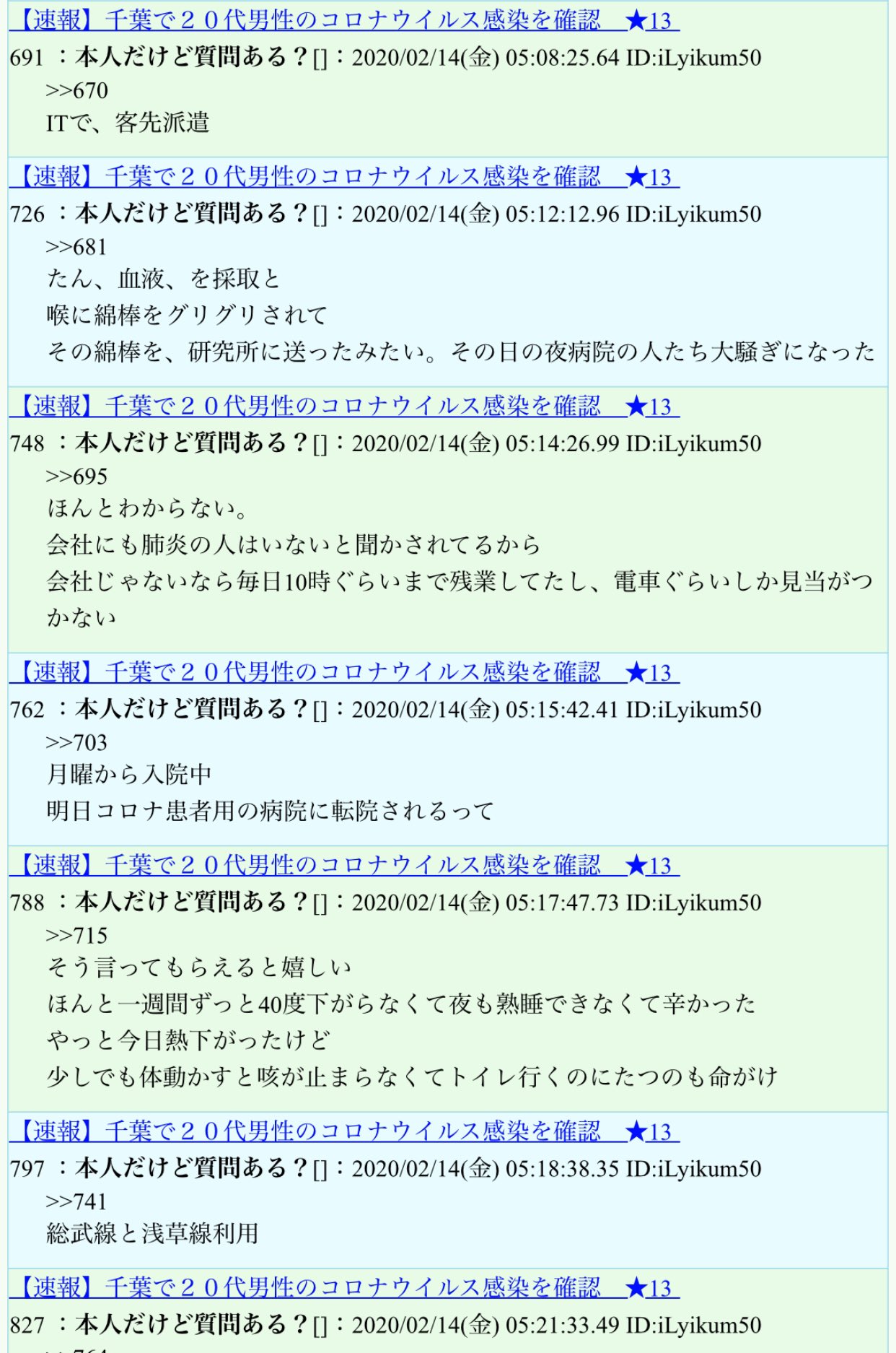 めこぶ Tokyo On Twitter 新型コロナウイルス感染の千葉20代男性本人っぽい書き込みなので 5chを見に行った 40 の高熱が1週間続いてるにも関わらず なかなか医療機関が受け入れてくれなかったらしい ちょっと動くだけで咳がツラいからトイレもしんどいって